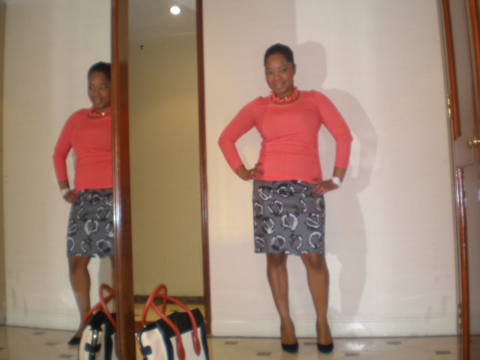 1. Shirt - Boat neck 3/4 sleeve, Cream; Skirt - Patterned, Cream & Red; Pumps - Suede, Taupe; Belt- Wide, cream